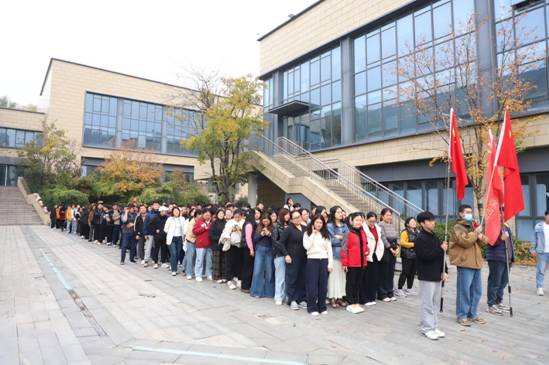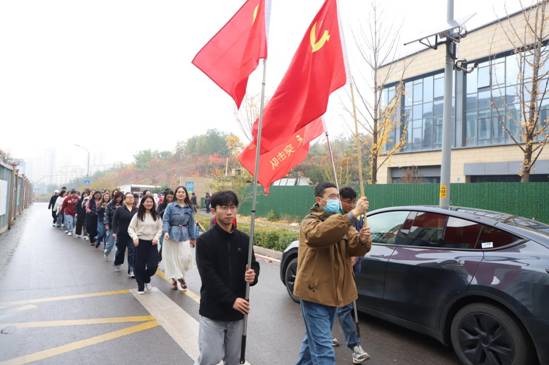 在党旗的引领下,全体员工从产业园整装出发,步行至韩仓河景观带起点。