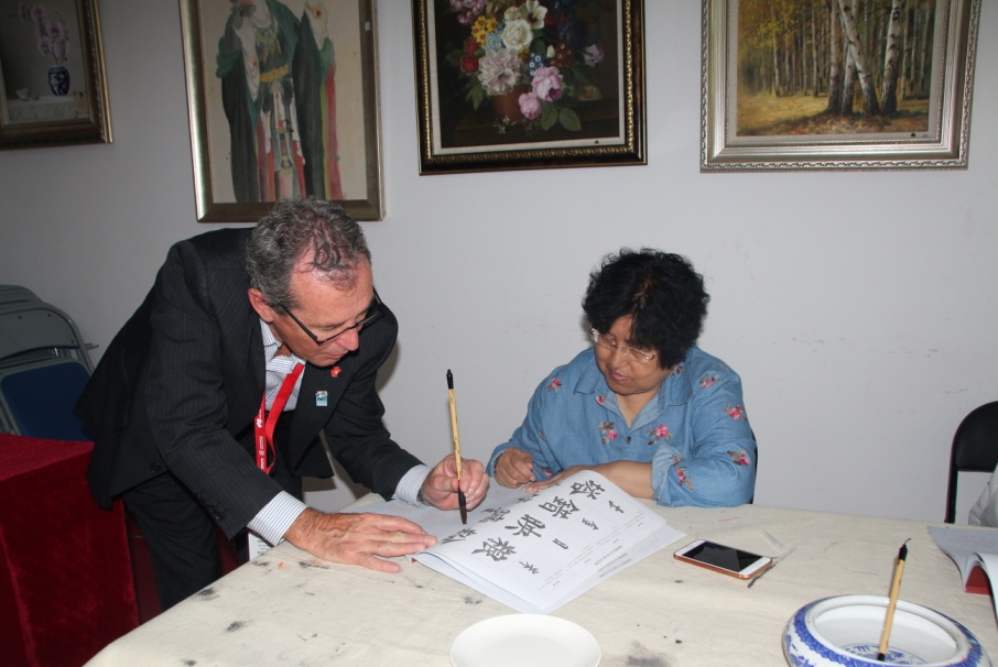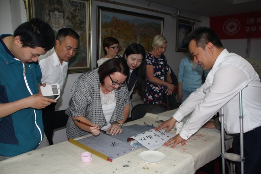 在王勇董事长的带领下,分别考察了我集团的文化长廊、多功能活动室,缪丽尔·柯比对展架上的艺术品、手工艺品频频称赞,并鼓励王勇董事长再接再厉,把残疾人文化产业做优做大做强。参观当天,“文艺支教 携手助残”济南市残疾人文联首届书法与美术培训班正在我集团多功能活动室举行,代表团积极与书法家交流,同残疾人学生们一起学习书法,展现出极大的兴趣。山东省书法家协会会员段志宏老师现场为外国友人书写了《友谊万岁》的书法作品。