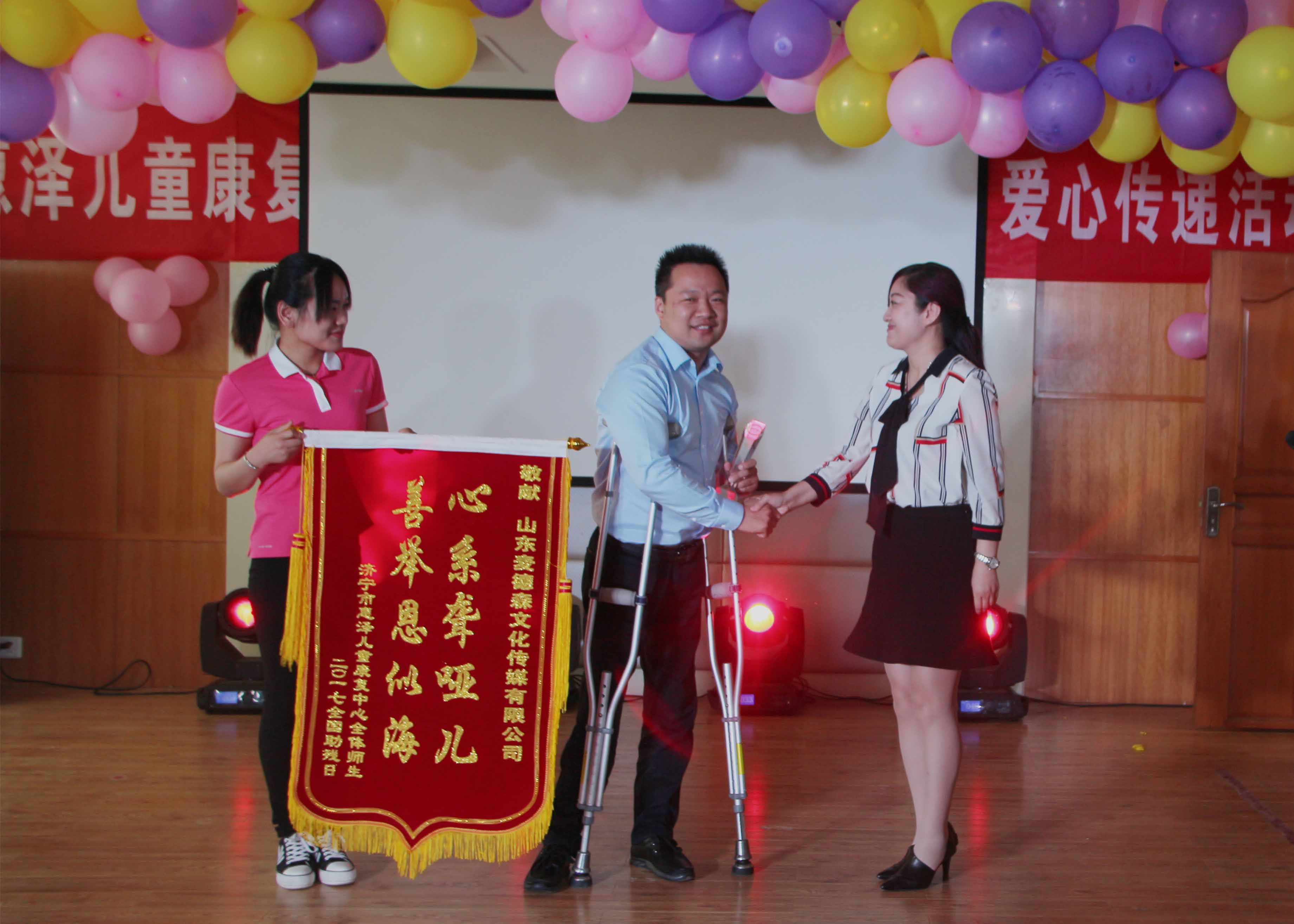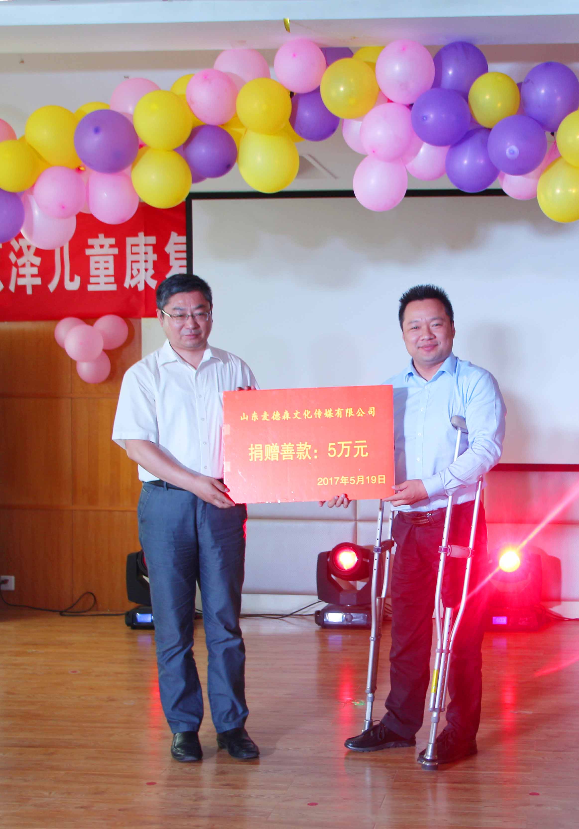 为迎接即将到来的第27个全国助残日,5月19日上午,济宁市惠泽儿童康复中心举行了隆重的爱心传递活动,其主题是“关爱残疾儿童,让爱洒满人间”。济宁市相关部门负责人及爱心人士、爱心企业家与康复中心的师生一起参加了本次活动。我集团董事长王勇先生受邀参加活动,并捐赠5万元的善款,用于支持残疾儿童康复事业的发展。
