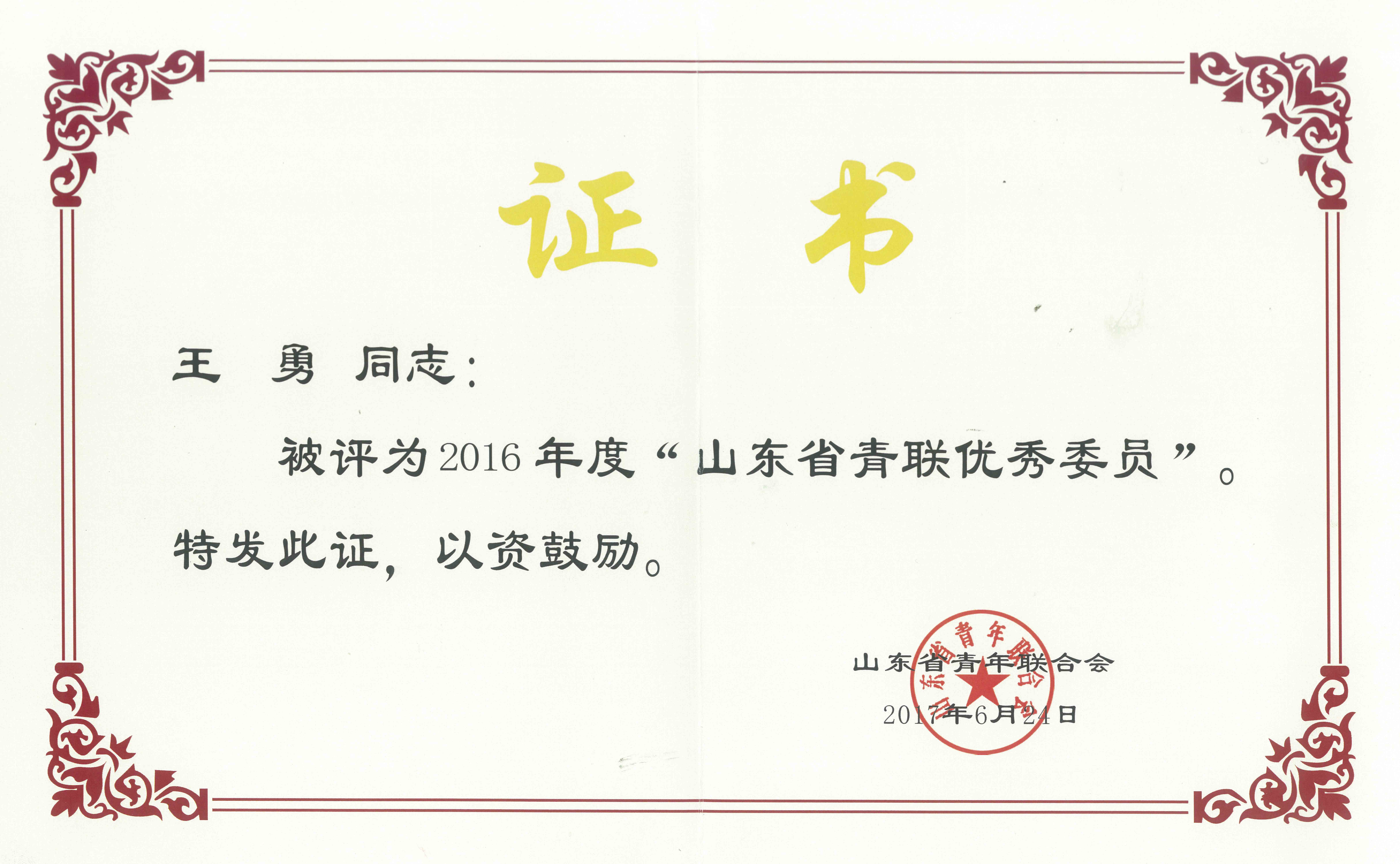 我集团董事长王勇荣获2016年度“山东省青联优秀委员”