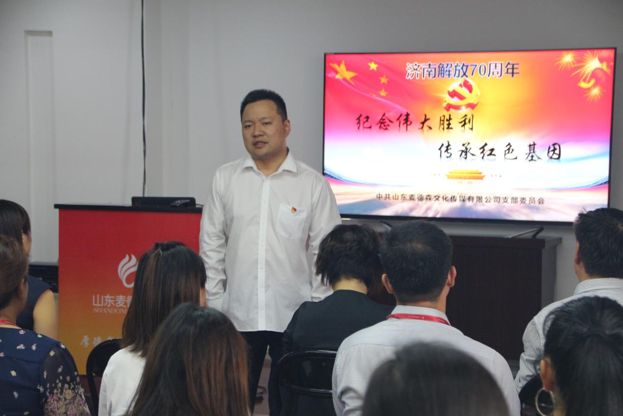 活动伊始,我集团公司党支部书记、董事长王勇首先进行讲话。他说,70年前的9月24日是济南战役胜利的日子,作为新时代的青春奋斗者,作为合格的共产党员,我们要铭记历史,积极传承老一辈共产党人的红色基因,不忘初心,继续前进,为建设新时代中国特色社会主义事业不懈奋斗。希望通过观看《济南战役》这部电影,大家能有更多的收获和感受,学习我军指战员面对困难和强敌,不怕牺牲不怕困难的革命乐观主义精神和方法,用于指导我们的思想和工作。