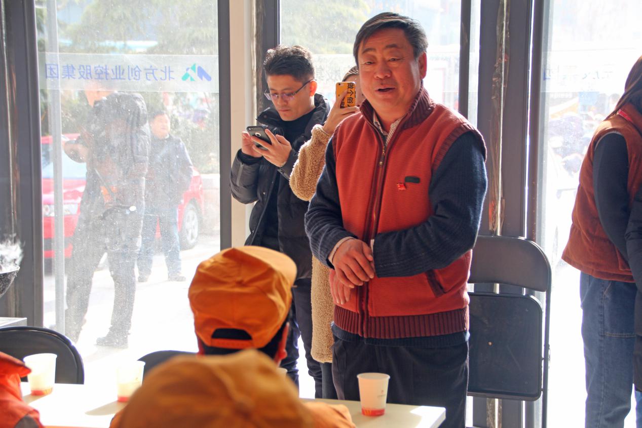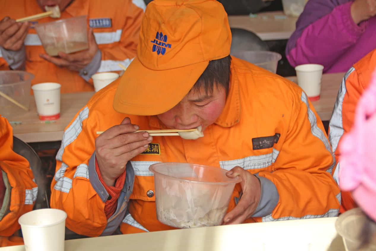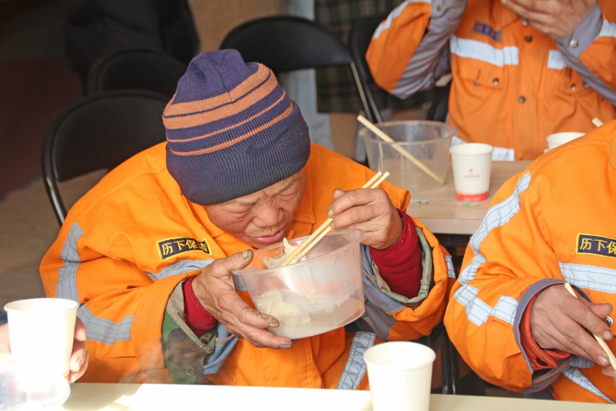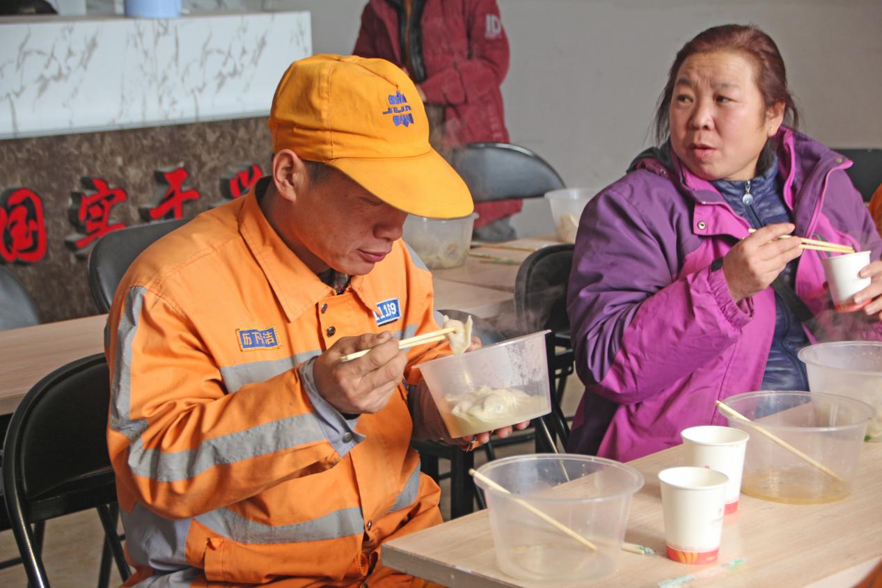 午饭时间一到,环卫工人开始陆续到达现场,桑守正副书记首先向到来的环卫工人们表达了感谢,并送去新年祝福。随后,党员突击队队员们把一碗碗热腾腾的水饺递到环卫工人的手中,大家津津有味的吃着水饺,队员们看在眼里,暖在心里。