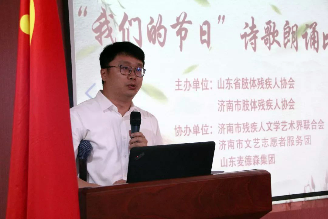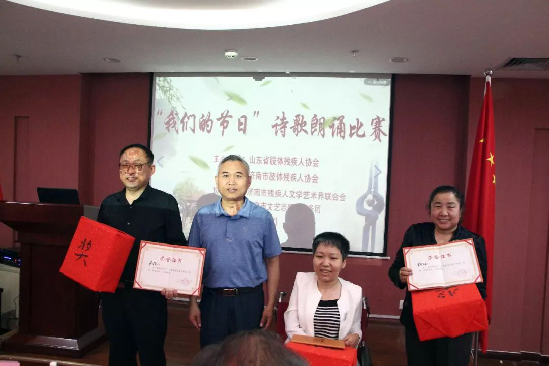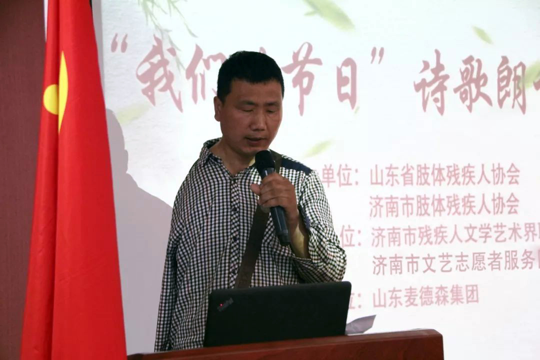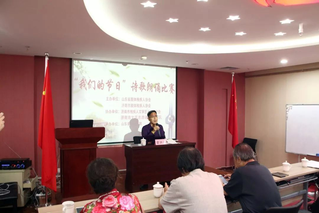 为庆祝第二十九次全国助残日,丰富残疾朋友的精神文化生活,展示残疾朋友积极向上,奋发进取的自强精神,5月24日由山东省肢体残疾人协会、济南市肢体残疾人协会联合主办,济南市残疾人文学艺术界联合会、济南市文艺志愿者服务团协办,江南网页版登录入口策划并承办的首届“我们的节日”残疾人诗歌朗诵比赛活动在江南网页版登录入口党群活动室成功举办。济南市残联副巡视员王建国,济南市残联维权处调研员杜献松,江南网页版登录入口党支部书记、济南市肢体残疾人协会、济南市残疾人文联主席王勇博士,济南市残文联作家协会主席韩振广、济南市残文联作家协会副主席房泽岸等领导出席本活动。赛事主办方特别邀请济南市市中区人大调研员、著名女诗人张斌、济南市评论家协会副主席窦洪涛、原山东大学文学院院长著名作家耿建华教授、原山东青年报社社长兼总编柳原担任此次赛事的专家评审;来自济南市各区县的16位残疾选手参加比赛。