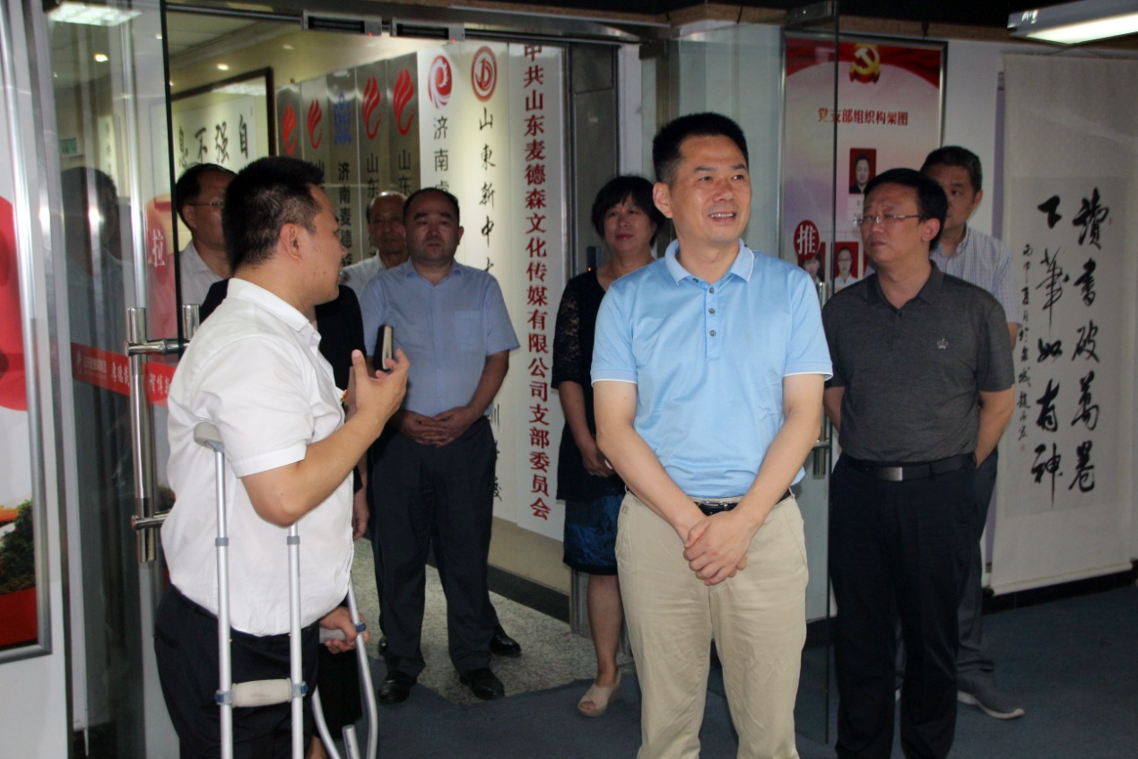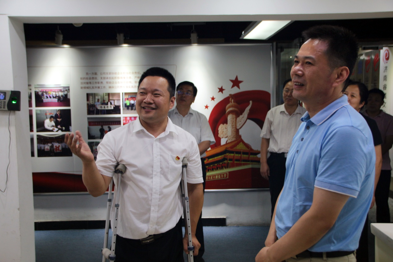 7月10日,历下区委副书记、区长谢兆村,区政府党组成员、政府办公室主任殷保钦,区政府办公室副主任、应急办主任刘效利,区党史研究中心主任刘向军,区残联理事长何力明,区民政局局长苏凤清,区科技局局长杨锋,区卫健局副局长张文,区文化和旅游局副局长田照河等领导一行莅临我集团总部,对集团党建工作及企业运营情况进行调研,并召开座谈会。集团党支部书记王勇博士等陪同调研。
