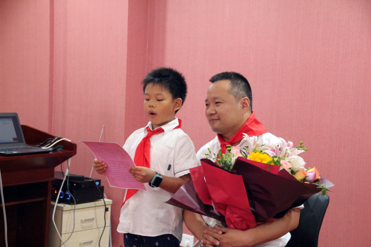 活动伊始,少先队员们观看了王勇博士的专题纪录片《拄着双拐一路奔跑》,大家被纪录片中王勇叔叔求学创业、助残扶残的画面深深感动。随后,少先队员代表向王勇叔叔敬献鲜花,并亲手为王勇叔叔佩戴红领巾。
