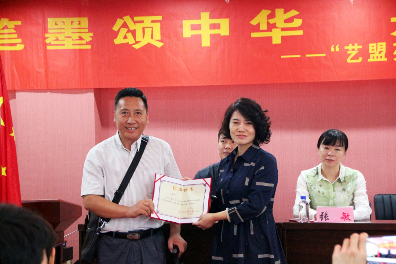 济南市文学艺术界联合会组联部副部长、济南市文艺志愿者服务团秘书长范莹现场宣读了“艺盟苑”第二届公益书法培训班结业人员名单,学员代表现场领取结业证书。