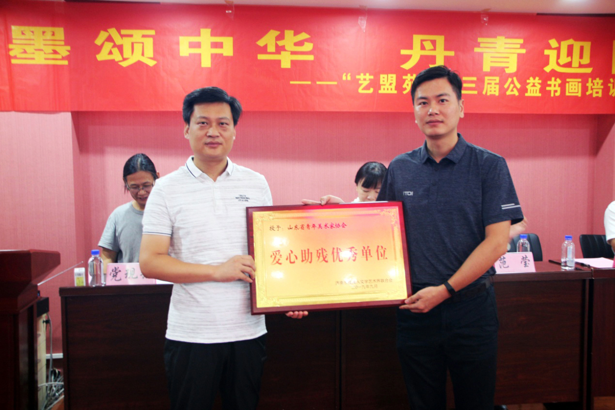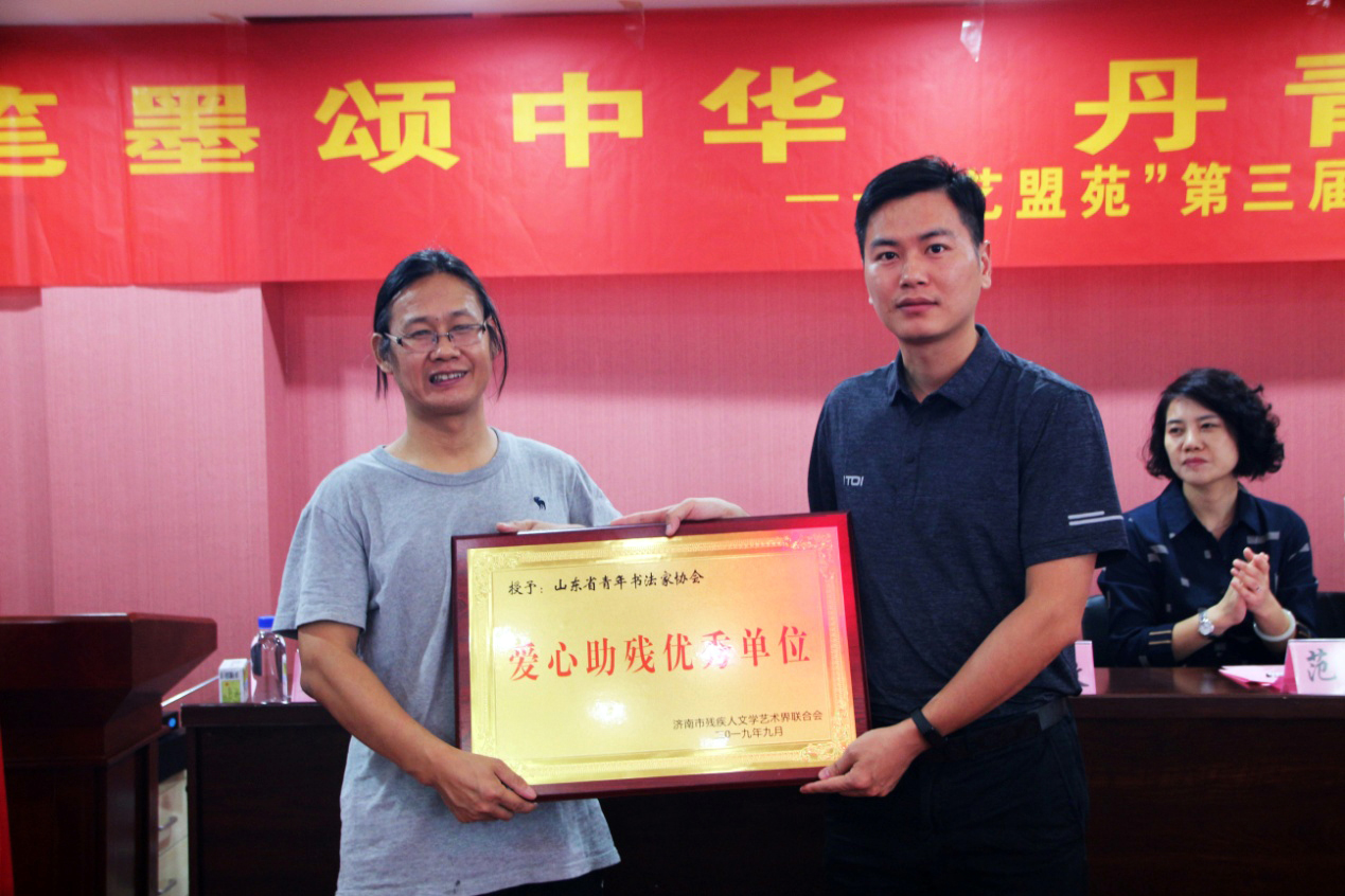 随后,济南市残文联与山东省青年书法家协会、山东省青年美术家协会签订助残协议,山东省青年联合会副秘书长侯磊为各协会代表颁发“爱心助残优秀单位”牌匾。
