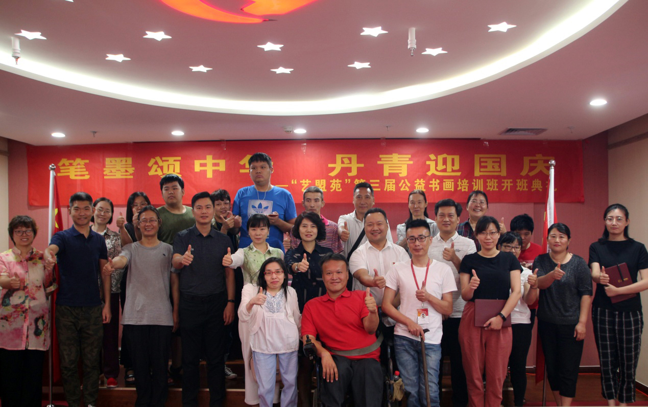 为庆祝祖国母亲70周年华诞,进一步提升全市残疾人精神文化素养,为有书画艺术追求的残疾人朋友提供学习机会和平台,帮助他们拥有一技之长实现书画艺术之梦,在第二届公益书法培训班结业后产生良好的社会反响基础上,应济南广大书画艺术爱好者的要求,9月29日,由济南市残疾人文学艺术界联合会主办,山东省青年书法家协会、山东省青年美术家协会协办,我集团承办的“笔墨颂中华、丹青迎国庆”——“艺盟苑”第三届公益书画培训班开班典礼在集团党群活动室成功举办。