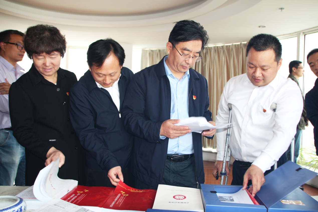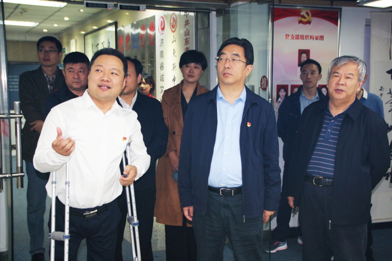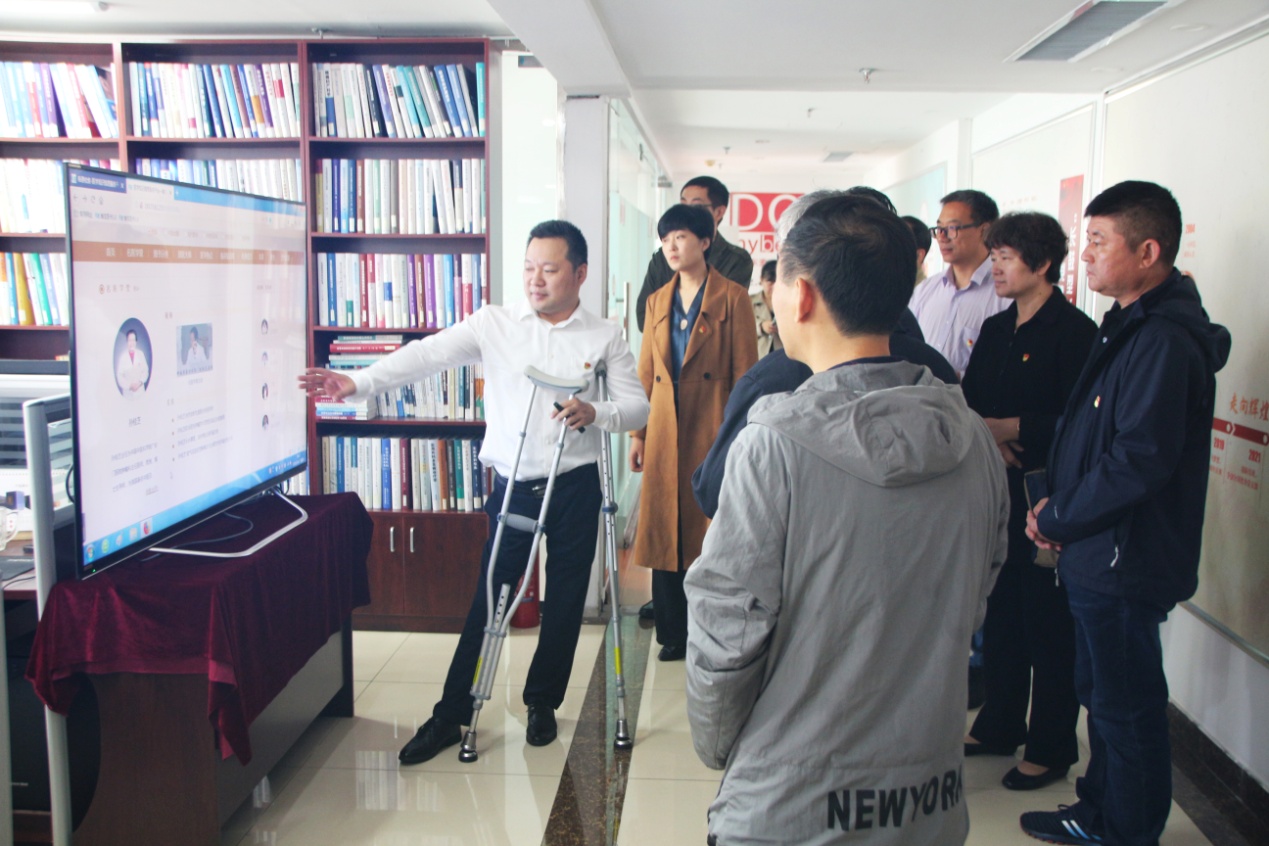在王勇博士的陪同下,黄庆峰等领导一行依次参观了集团党建活动室、企业文化墙、残疾人文化艺术长廊,以及集团公司各业务职能部门办公区域,对集团党建工作、企业文化建设、医学知识信息服务平台——“博览医书”项目以及残疾人事业发展等工作进行了深入了解。