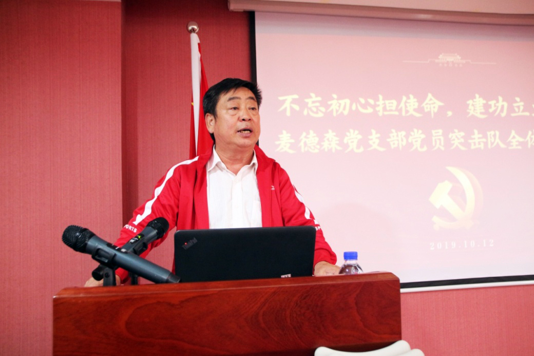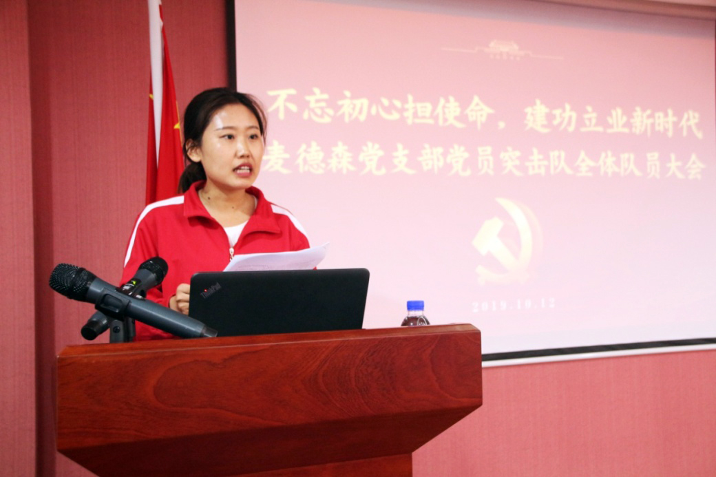 为深入贯彻落实习近平新时代中国特色社会主义思想,扎实开展“不忘初心、牢记使命”主题教育,根据上级党委部署和安排,结合集团实际,10月12日下午,集团党支部在党群活动室组织召开“不忘初心担使命、建功立业新时代”麦德森党支部党员突击队全体队员大会。集团党支部书记王勇博士出席会议并讲话,党支部副书记桑守正主持大会,支部全体党员、党员突击队全体队员参加会议。
