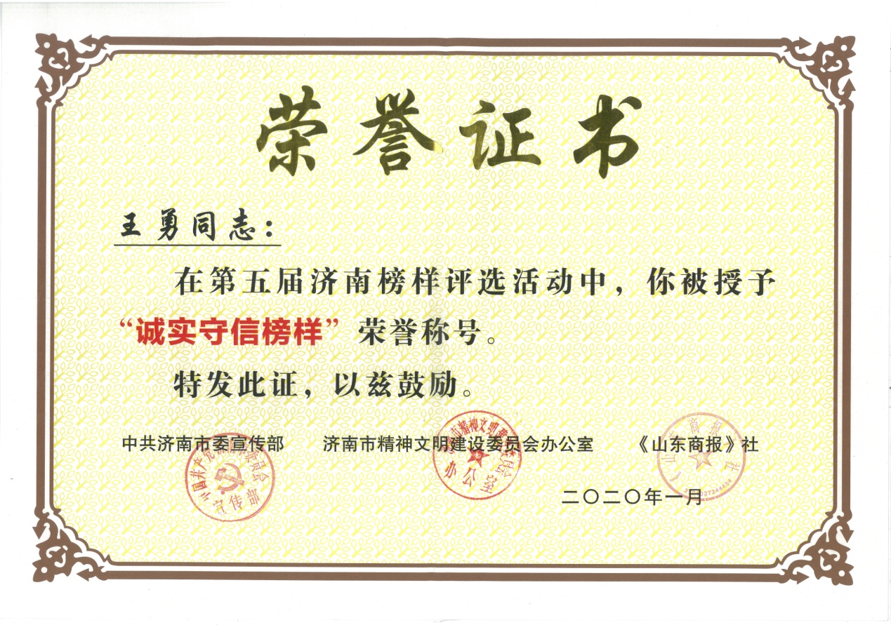 热烈祝贺我集团党支部书记王勇博士荣获第五届“济南榜样”荣誉称号