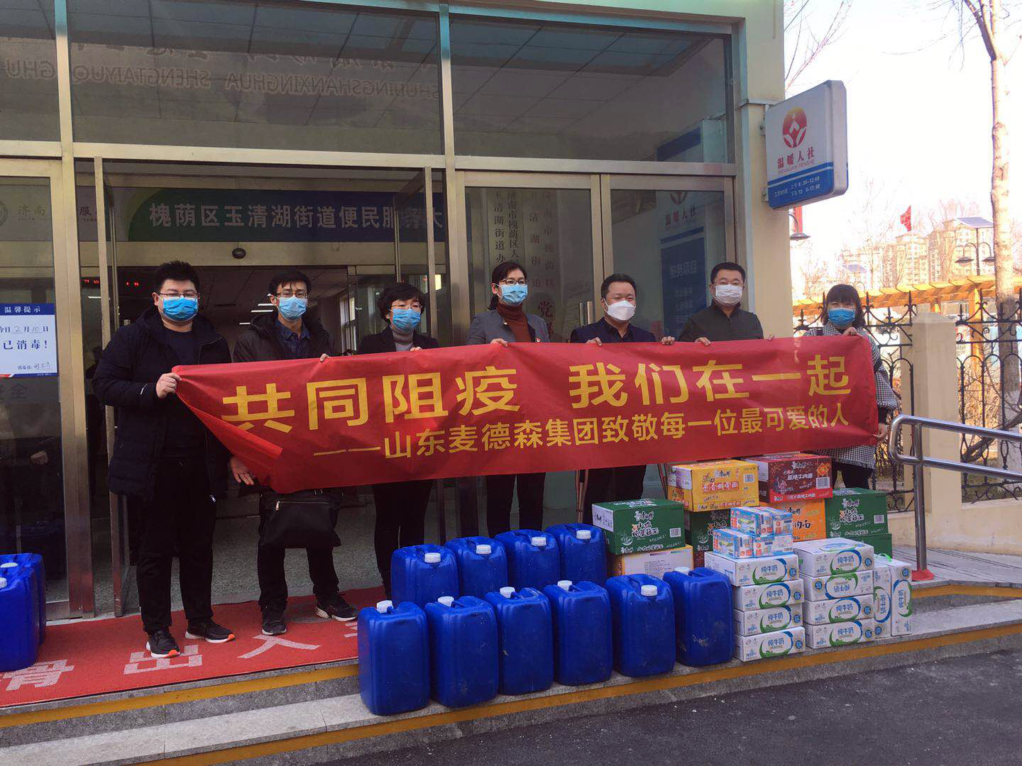 2月10日上午,我集团党支部书记王勇博士带领企业员工来到天桥区北园办事处鑫苑名家社区,向社区捐赠消毒液等总金额1万余元的抗疫物品,助力疫情防控。