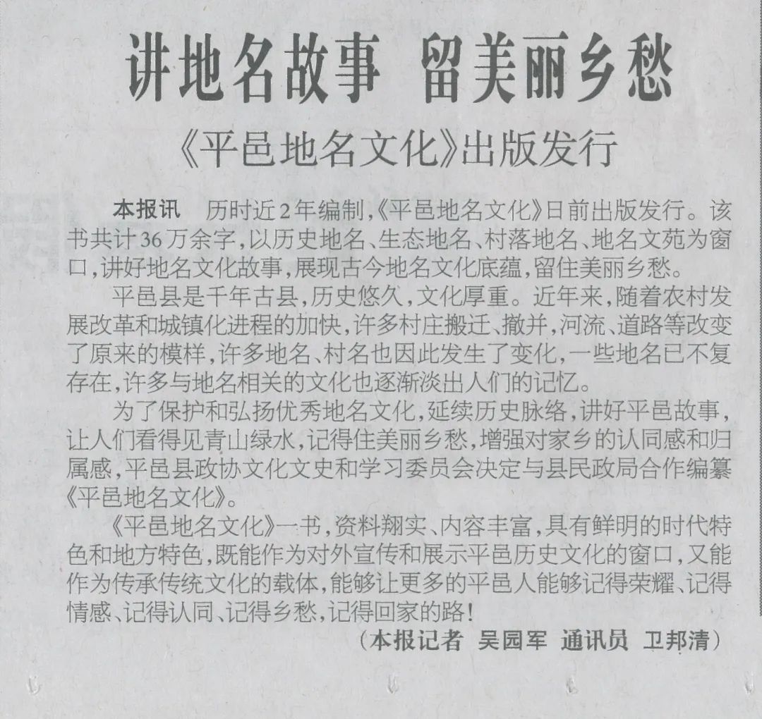 3月30日,《联合日报》以“讲地名故事、留美丽乡愁”为题,聚焦报道我集团史志事业部承印的《平邑地名文化》出版发行。