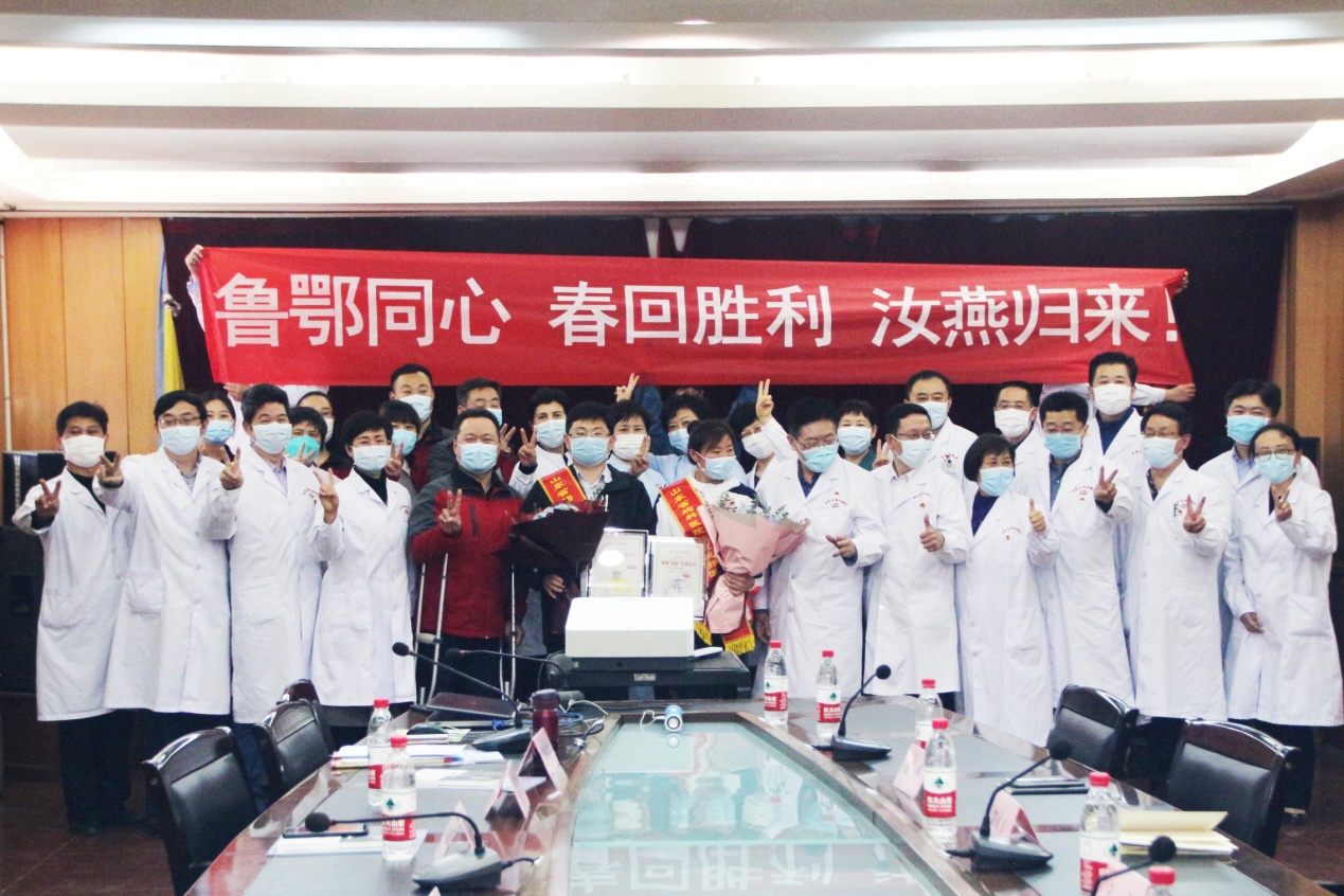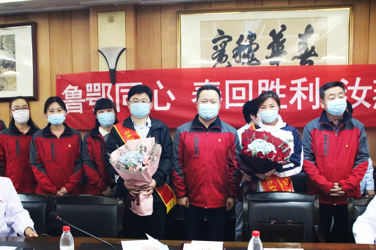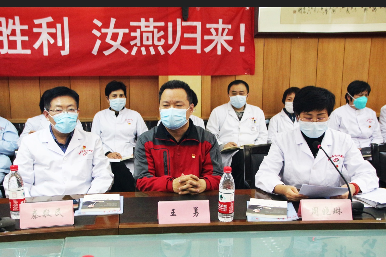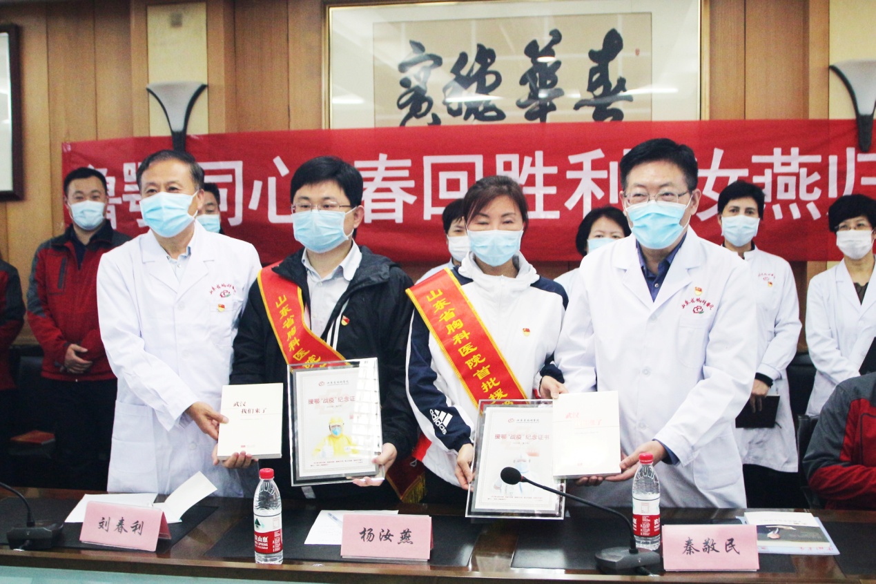 山东省胸科医院党委书记秦敬民在总结发言中对两名援鄂战士“逆行出征、勇毅前行”的责任担当表示赞赏,对我集团前期捐赠口罩等抗疫物资,支援胸科医院疫情防控工作的善举表示衷心感谢,他指出,刘春利、杨汝燕两名援鄂战士不负众望、不辱使命,与黄冈人民心连心、手挽手,同心同德、共克时艰,交上一份完美的“黄冈答卷”,是胸医人的英雄、胸医人的骄傲!
