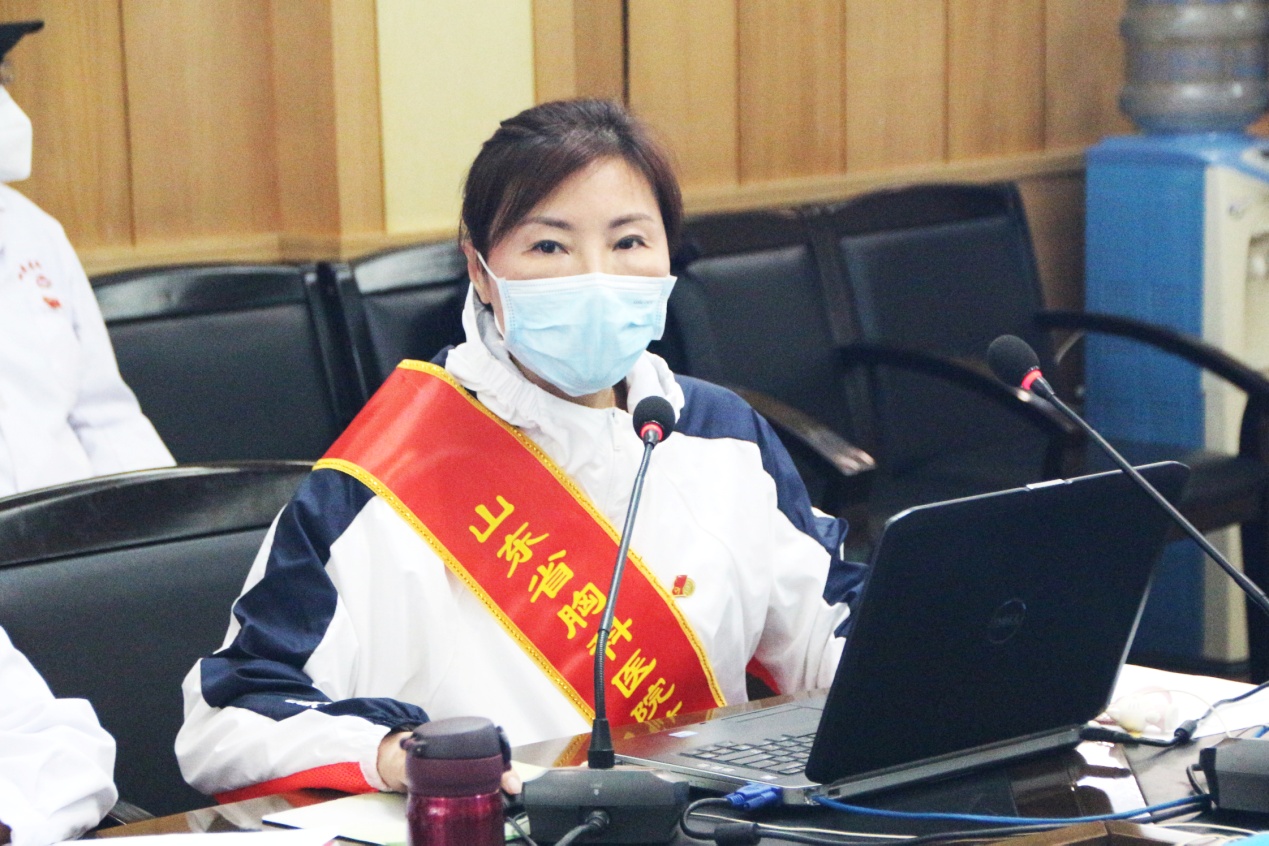 山东省首批援鄂医疗队副队长杨汝燕在援鄂事迹报告中向大家详细介绍了她所在医疗队的情况以及在黄冈大别山区医疗中心期间救治患者的经历,她谈到,援鄂工作期间的工作强度比较大,感染风险同样比较大;不仅患者的压力大,医疗队队员的压力同样很大,在这个过程中,队员们互相鼓励,提士气、鼓干劲,在工作中不断提升凝聚力;同时,“条件不够、智慧来凑”,每一名队员都在出谋划策、每一个人都有责任担当,“人心齐、泰山移”!援鄂医疗任务的完成有赖于每一名队员的付出和奉献。