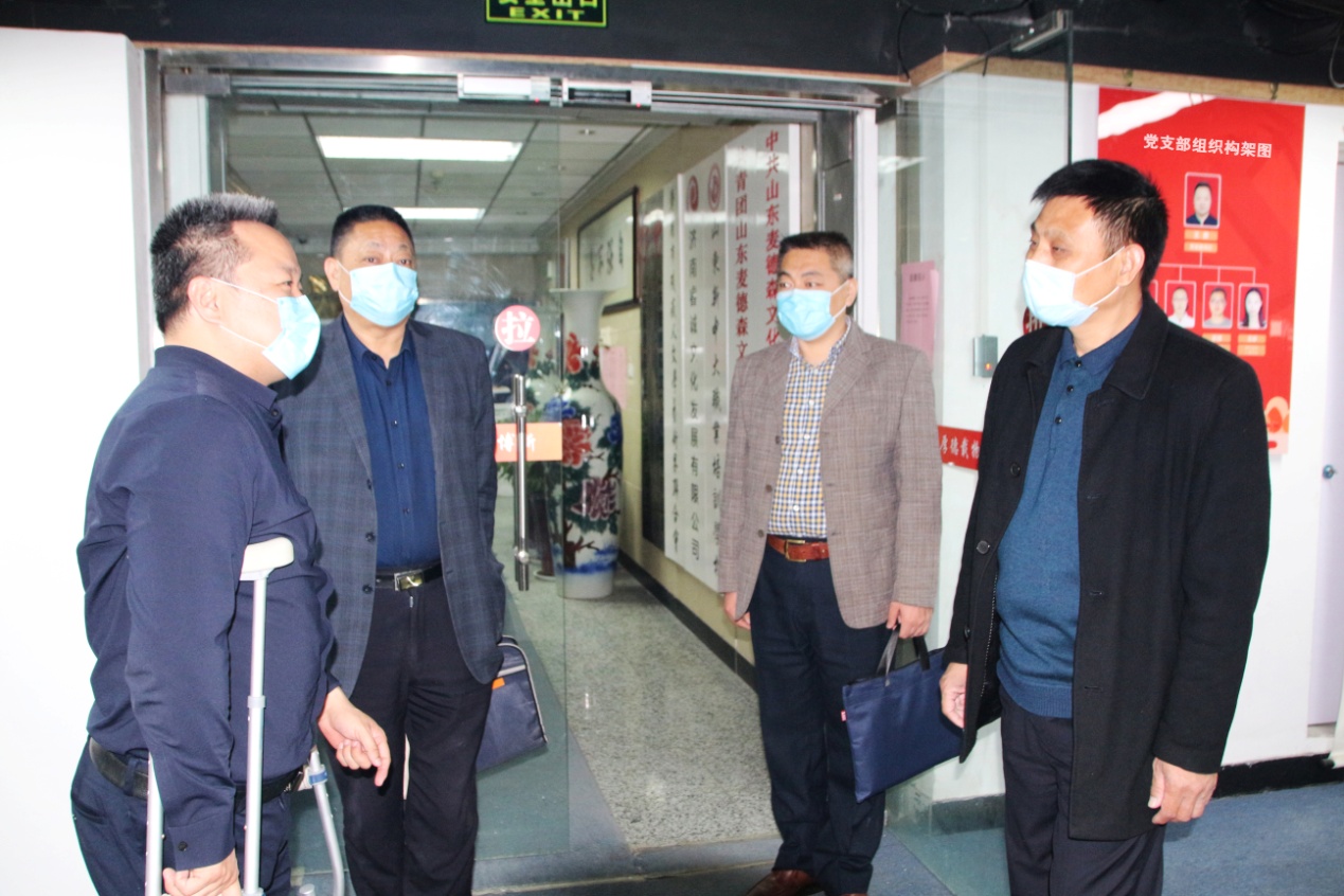4月22日,山东省个体私营企业协会常务副会长、秘书长王新成、副秘书长梁峰等领导莅临我集团,就疫情防控期间企业复工复产情况调研指导工作,并进行座谈交流,集团党支部书记王勇博士等陪同调研。