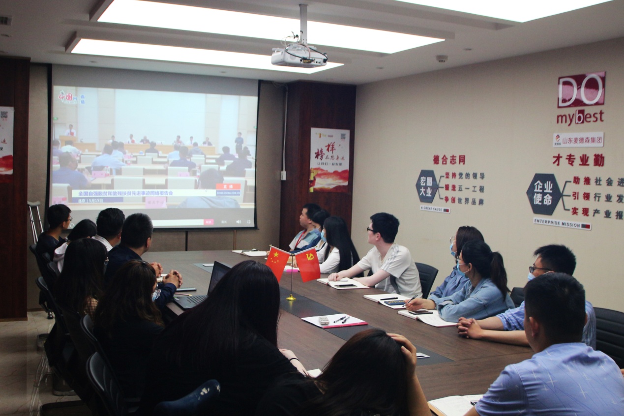 为近距离感受基层贫困残疾人脱贫攻坚的鲜活事迹,学习新时代残疾人自强不息、顽强拼搏的时代精神,感恩社会各界扶残助残的高尚美德,5月15日,我集团“融爱之家”在7楼会议室组织观看“全国自强脱贫和助残扶贫先进事迹”网络报告会现场直播。集团党支部书记王勇博士、副书记桑守正等集团领导出席活动,“融爱之家”全体成员,企业青年员工代表参加活动。
