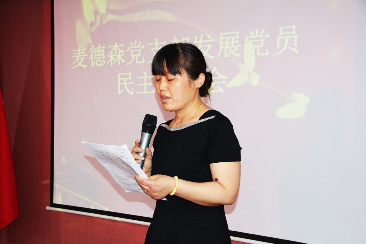 会议听取了入党积极分子和党员发展对象候选人宣读入党申请、培养联系人发表培养考察意见,后通过支部党员、群众代表进行无记名投票表决,和现场唱票统计:同意推荐张永华、闫金峰、黄娜为党员发展对象;同意吸收黄亚平、王金波、张晶华、宋小维、王瑞5名同志为新一批入党积极分子。